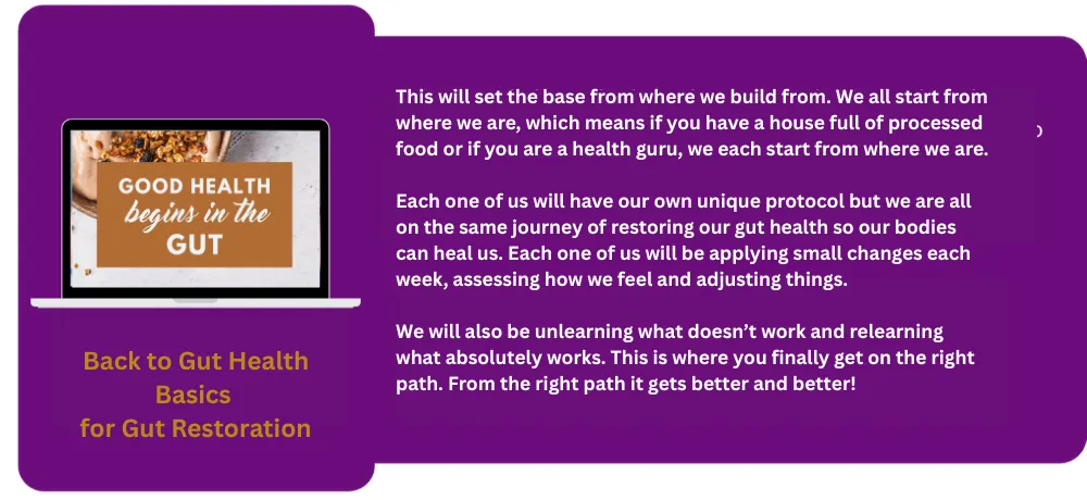 Each person is unique, each gut is unique, and each health situation is unique. We are all working on Going back to basics but each of us will be making our own changes that fit us. We answer your questions and help you if you get stuck. The Facebook Group is filled with people on the same journey.